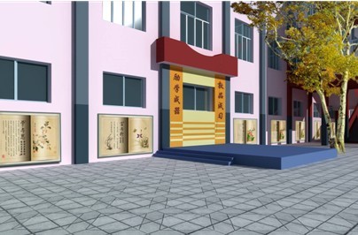 设计说明: 东院南楼一层文化墙环境文化设计围绕校训展开,主席台中心位置,展示校训,两侧以图文并茂的形式展示品行修养与学问涵养方面的内容。