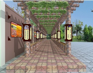 设计说明: 此处廊架位于操场处,环境文化营造以运动特色为主。廊架木柱上以健身图案与运动语言相结合的方式来营造环境氛围;其后体育墙则展示学校体育健儿相关内容。整个环境文化氛围的营造,既体现了学校习惯养成教育又以古色古香之色调,展现学校书香校园之氛围。