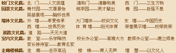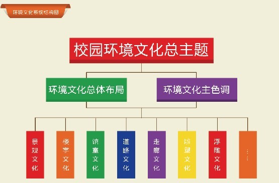 学校环境文化整体规划主要包括三部分:环境文化主题规划、环境文化主色调设计、校园环境布局规划设计。环境文化在设计中着重把握四点原则:整体规划、分步实施、把握主题、系统设计;理念文化、视觉文化、环境文化和谐统一;教育环境,环境教育,处处有景,景景育人;以人为本、个性化、景观性、因地制宜。温馨的校园环境,丰厚的人文底蕴、先进的办学理念,鲜明的办学特色,浓厚的学习氛围,不懈的创新意识,构成了学校一道亮丽的风景线,这是我们创建特色品牌学校的最终追求。营造学校的创新环境是打造学校品牌的必要条件,打造学校品牌又优化了学校的创新环境,两者相辅相承,相得益彰。学校环境文化建设对社会可以起到积极的影响,在日益激烈的学校竞争中可以提升学校的品牌影响力,增加学校的竞争力,以潜移默化的教育作用无时无刻地影响着学生,对展现学校品牌形象有着重要作用。